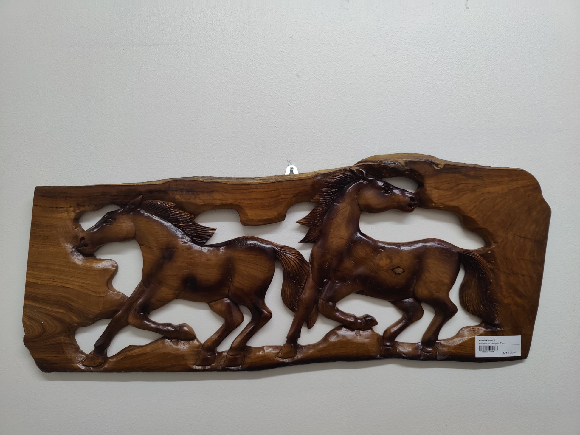 Käsityönä tehty iso hevostaulu, puuta, 73 cm.